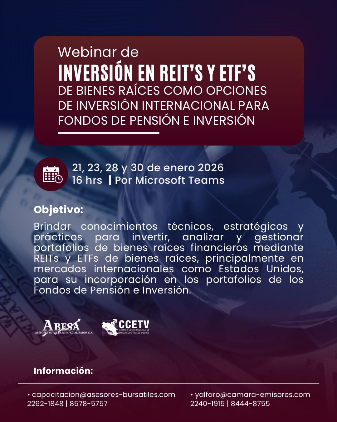 Webinar de Inversión en REIT's y ETF's de Bienes Raíces como opciones de Inversión Internacional para Fondos de Pensión e Inversión.